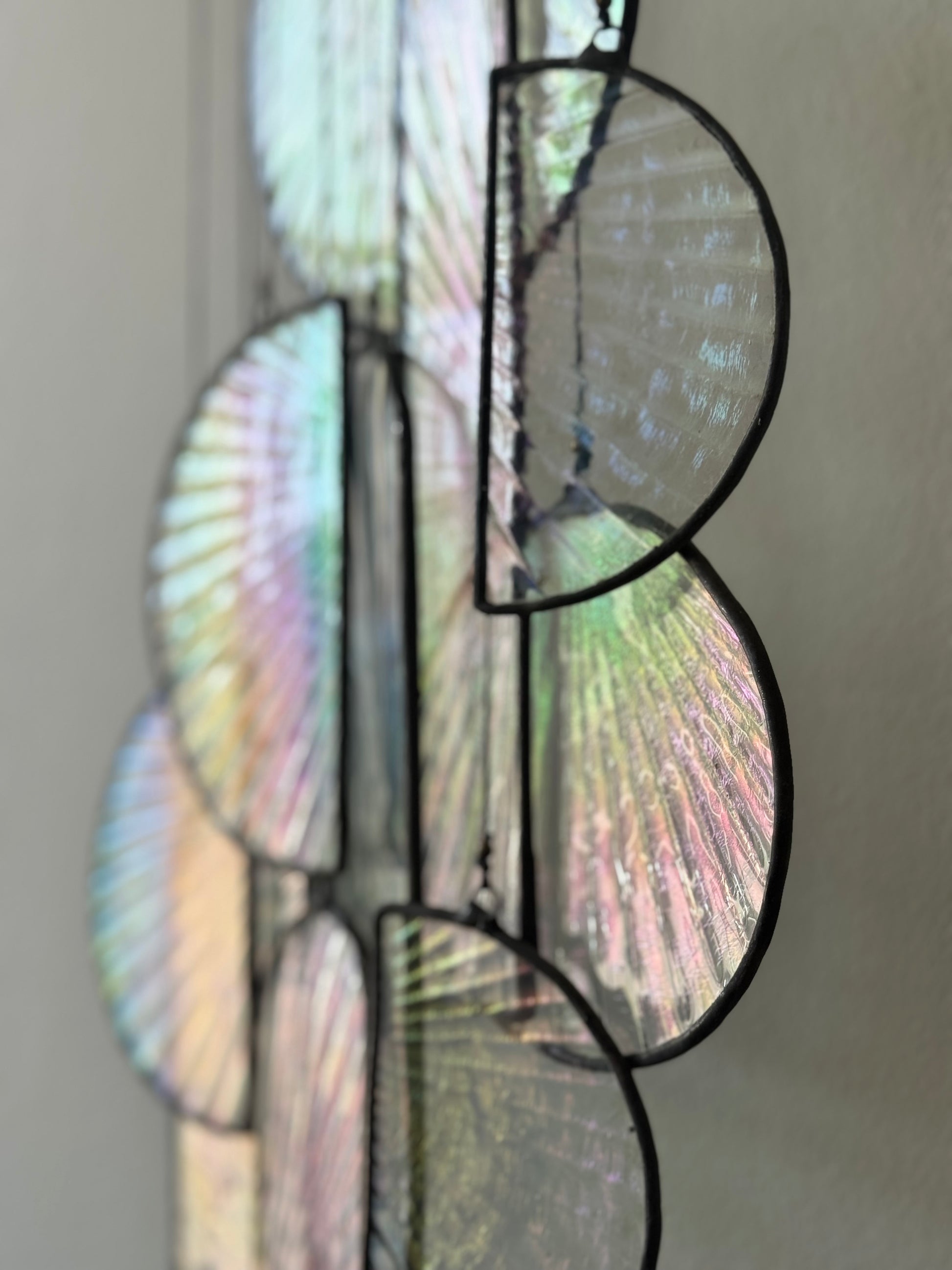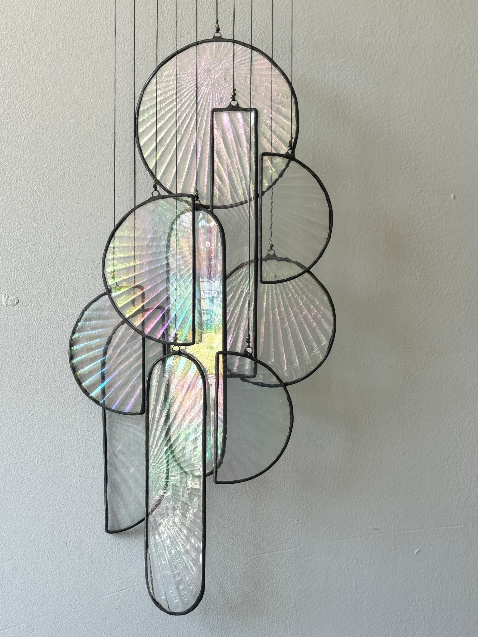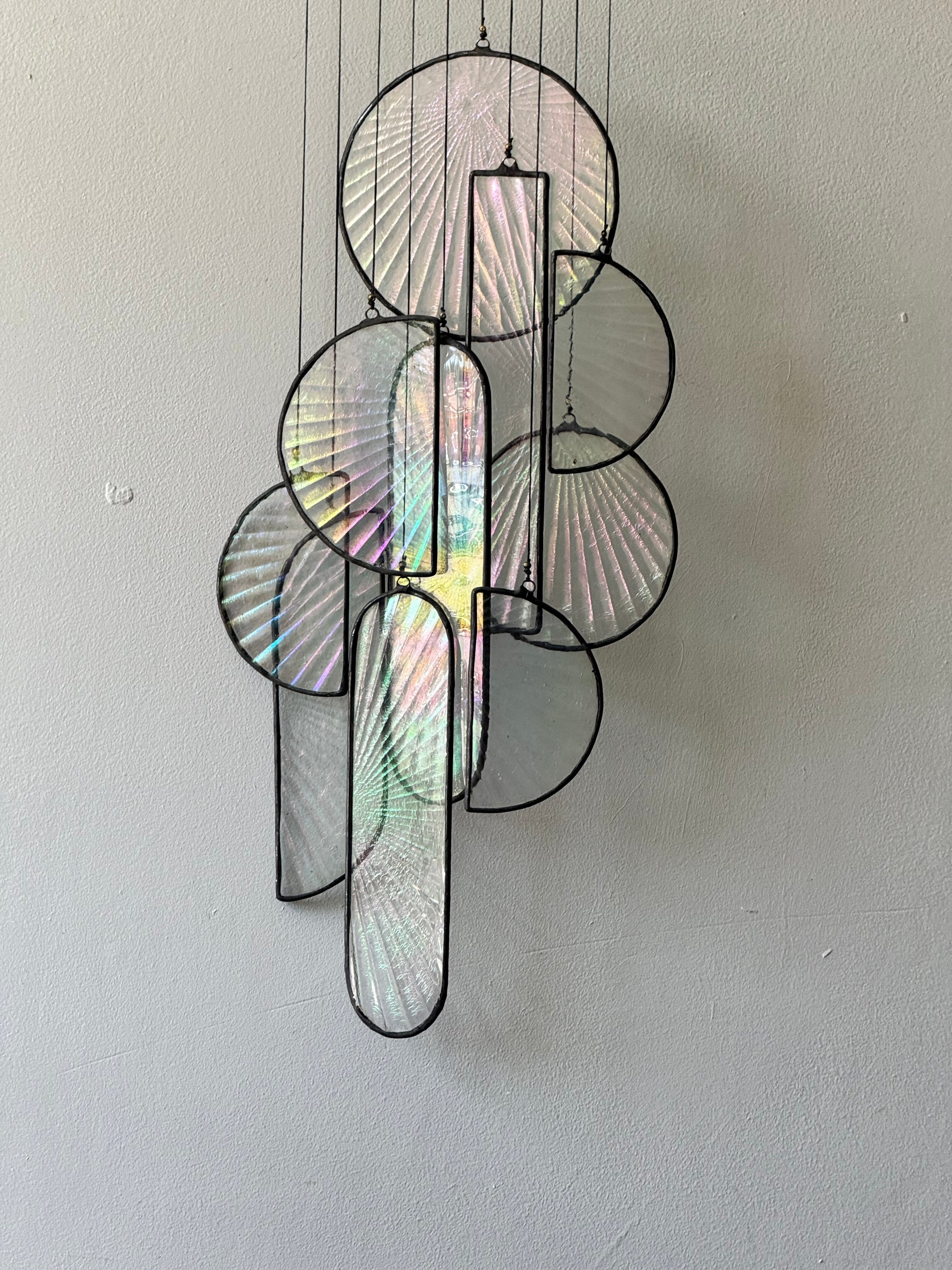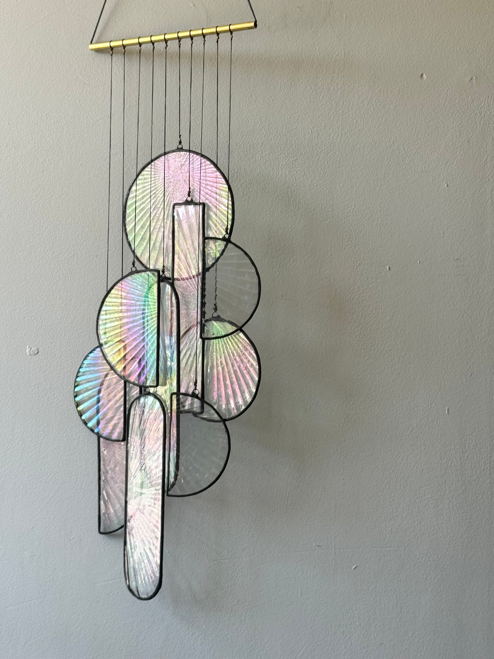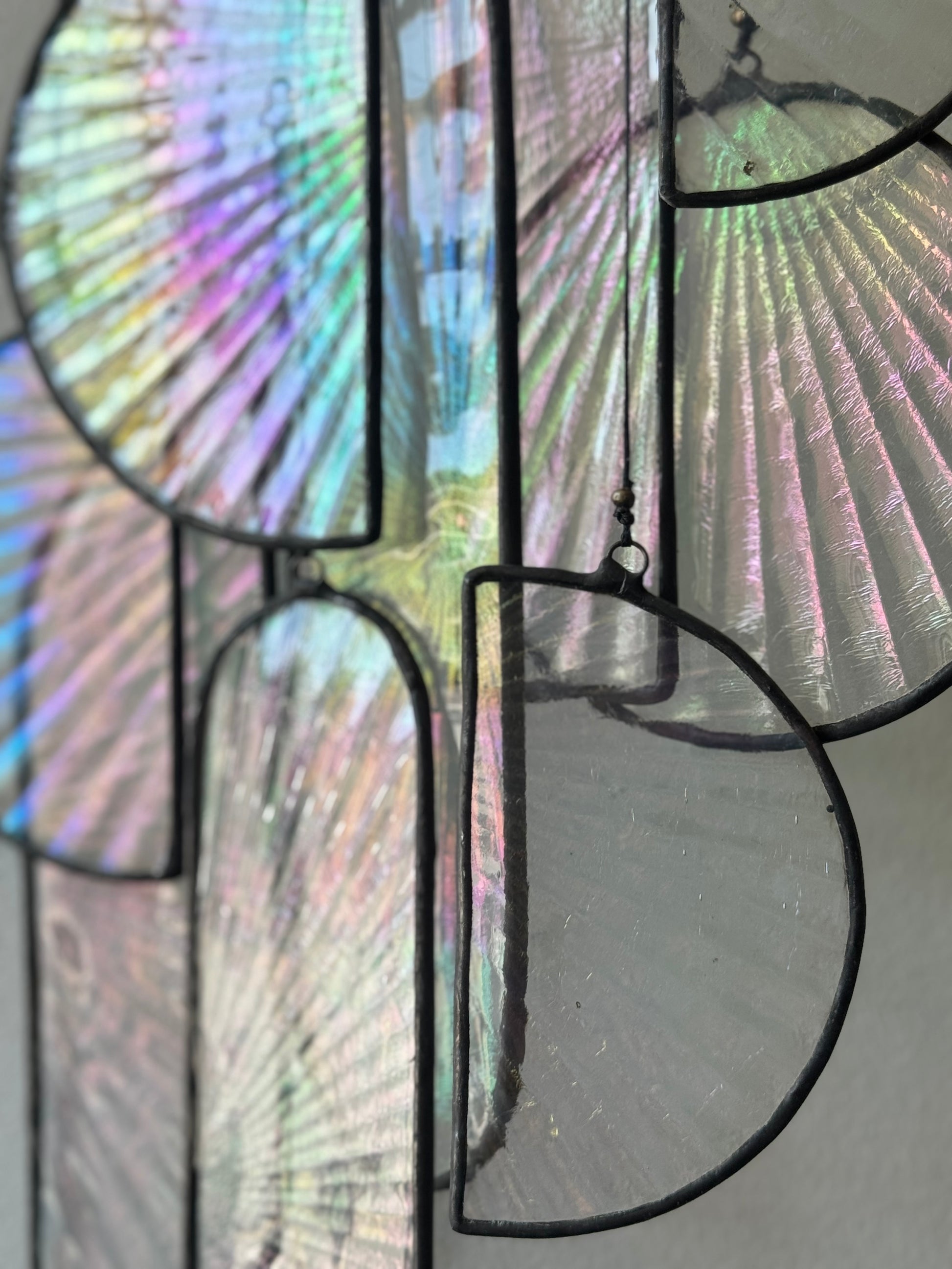 We make a range of wall or window decorations designed to compliment your home. The pieces represent taking stained glass back to basics for a more simplified and versatile feel. The decorations rely on the impact of colour and shape to tell their story. Each piece has a unique range of colours and shapes which are hung in different combinations to create new and exciting formations. They can be used as wall or window hanging decorations. This piece has multiple hand cut stained glass shapes, with a black patina finish. Each piece of glass is hung with linen cord from a brass bar, which can be displayed on a wall or in a window. Each piece of glass is carefully chosen to show different colours and textures. Completely unique and individual, no two are the same.