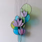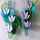 The glass pieces are in shades of teal, turquoise, green, and purple, with a mix of smooth and textured surfaces that catch the light differently. The overall shape resembles stylized lotus flowers or leaves stacked together. The black outlines of the glass pieces create a striking contrast and emphasize the individual shapes.