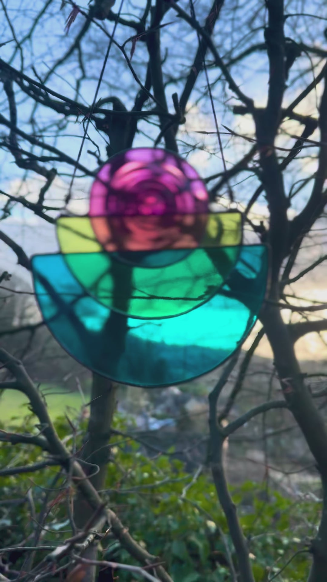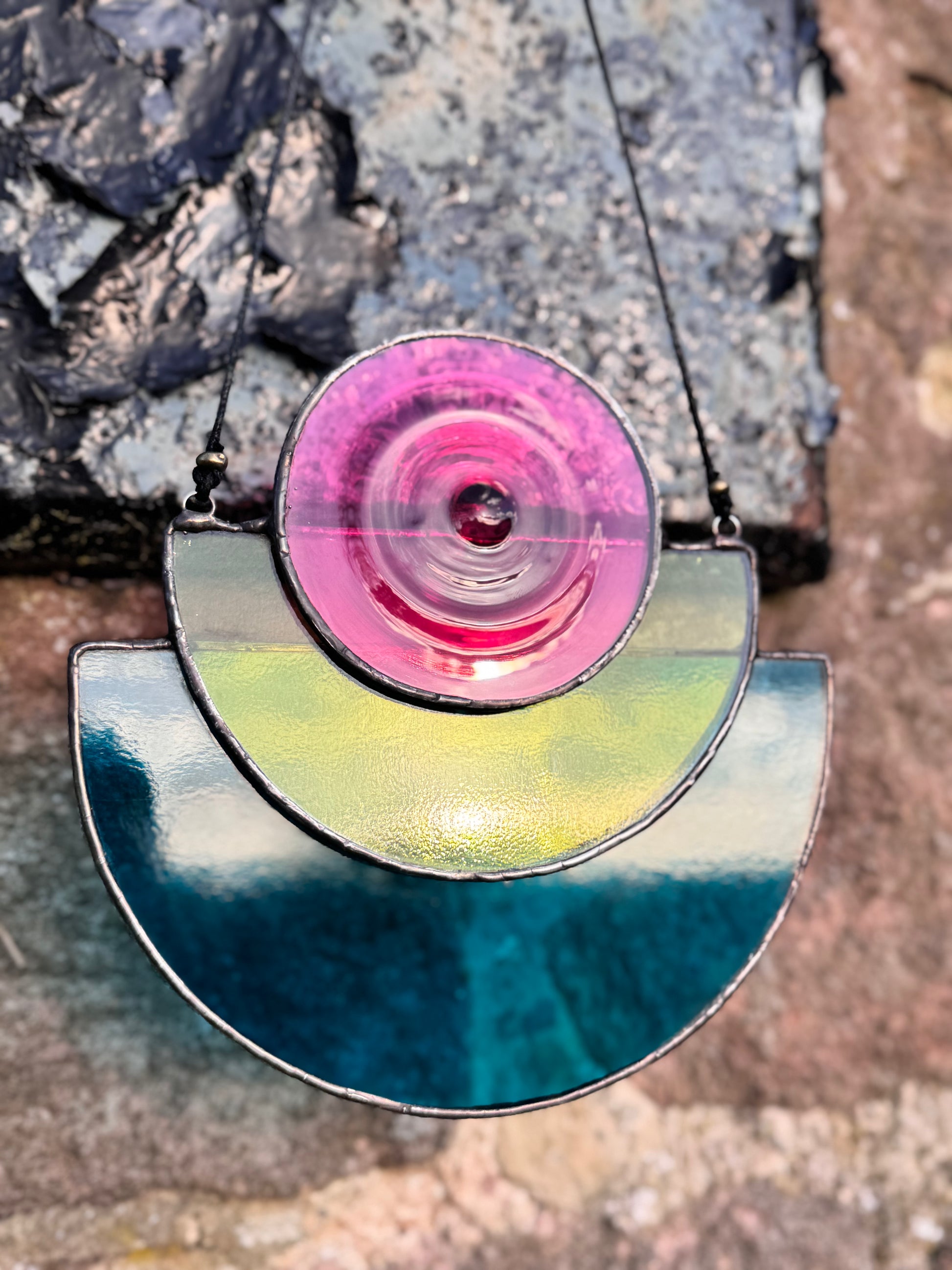 Pink Moon is a wall or window decorations designed to compliment your home. The pieces represent taking stained glass back to basics for a more simplified and versatile feel. The decorations rely on the impact of colour and shape to tell their story. Each piece has a unique combination of colours and shapes which are hung in different ways to create new and exciting formations. They can be used as wall or window hanging decorations. This piece has 3 hand cut, copper foiled stained glass shapes, with a black patina finish. Each piece of glass is hung with hemp cord from a brass hoop, which can be displayed on a wall or in a window. Each piece of glass is carefully chosen to show different colours and textures.