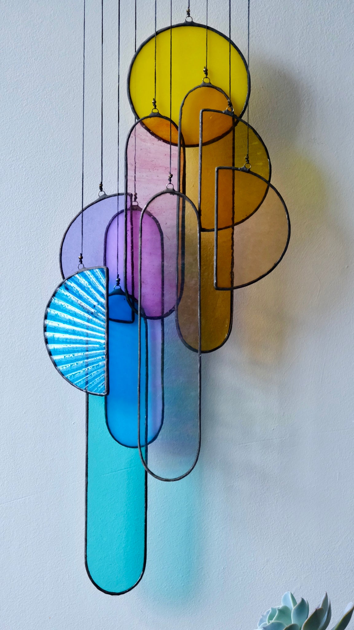 We make a range of wall or window decorations designed to compliment your home. The pieces represent taking stained glass back to basics for a more simplified and versatile feel. The decorations rely on the impact of colour and shape to tell their story. Each piece has a unique range of colours and shapes which are hung in different combinations to create new and exciting formations. They can be used as wall or window hanging decorations. This piece has multiple hand cut stained glass shapes, with a black patina finish. Each piece of glass is hung with linen cord from a brass bar, which can be displayed on a wall or in a window. Each piece of glass is carefully chosen to show different colours and textures. Completely unique and individual, no two are the same.